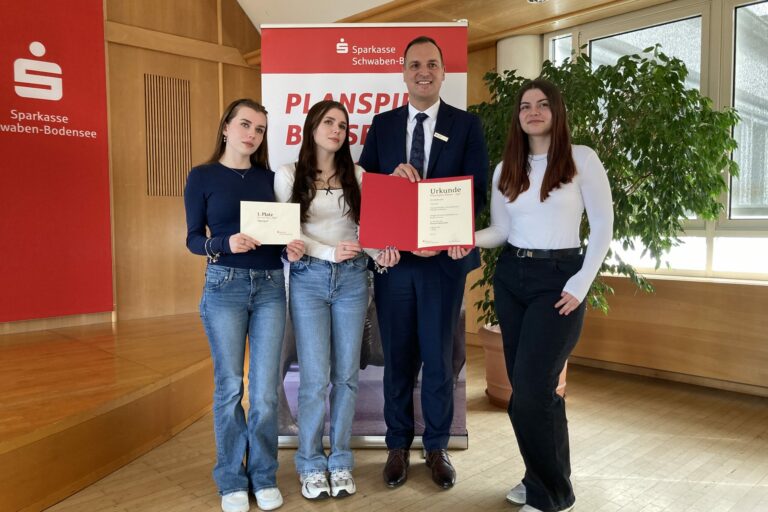 Drei Schülerinnen der Ausbildung Wirtschaft der FOSBOS Lindau räumen in Lindau beim Planspiel Börse ab.