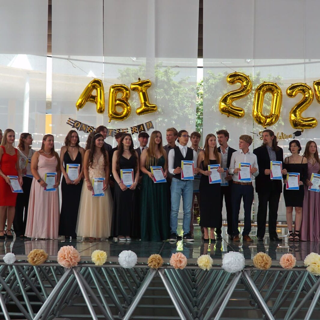 Aber zurück zur Zeugnisübergabe: Nachdem bei einer Fragerunde unser Landrat Elmar Stegmann und unsere OB Dr. Claudia Alfons, sowie Juri Link als Elternbeiratsvorsitzender und Antje Schubert, Schulleiterin des BSZ Lindau, ein wenig aus dem Nähkästchen plauderten mit Blick auf ihre eigene Schul- und Studienzeit, kriegten die Lehrer noch ein bisschen Ihr Fett, v.a. aber viel Lob ab, als unsere SMV mit Simon, Bence, Morteza und Charlotte lustige Anekdoten über die einzelnen Lehrkräfte mit dem Publikum teilten. Zwischendrin spielte unsere Schulband auf und dann wurden auch schon unsere Besten geehrt. Uns so standen, nachdem alle Ihre Zeugnisse in Händen hielten, insgesamt 26 Schülerinnen und Schüler mit einer 1 vor dem Komma auf der Bühne – also 20% des diesjährigen Prüfungsjahrgangs. Unsere besten 12.-Klässler je Ausbildungsrichtung erhielten außerdem von unseren externen Kooperationspartnern noch einen Ehrenpreis.