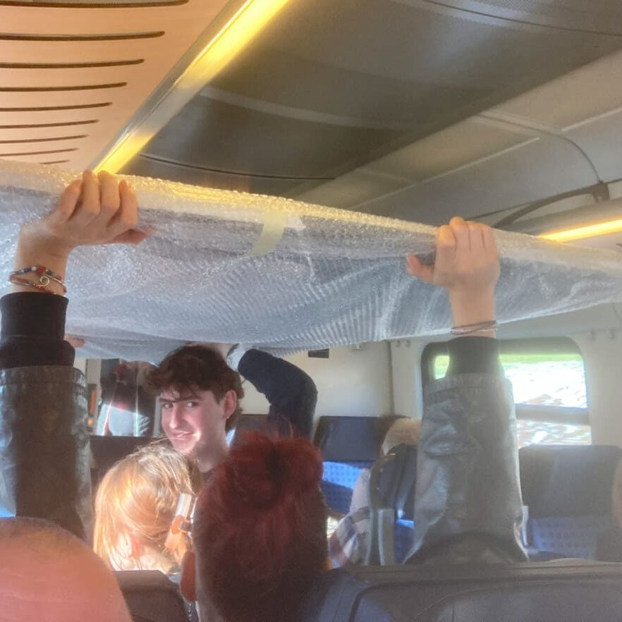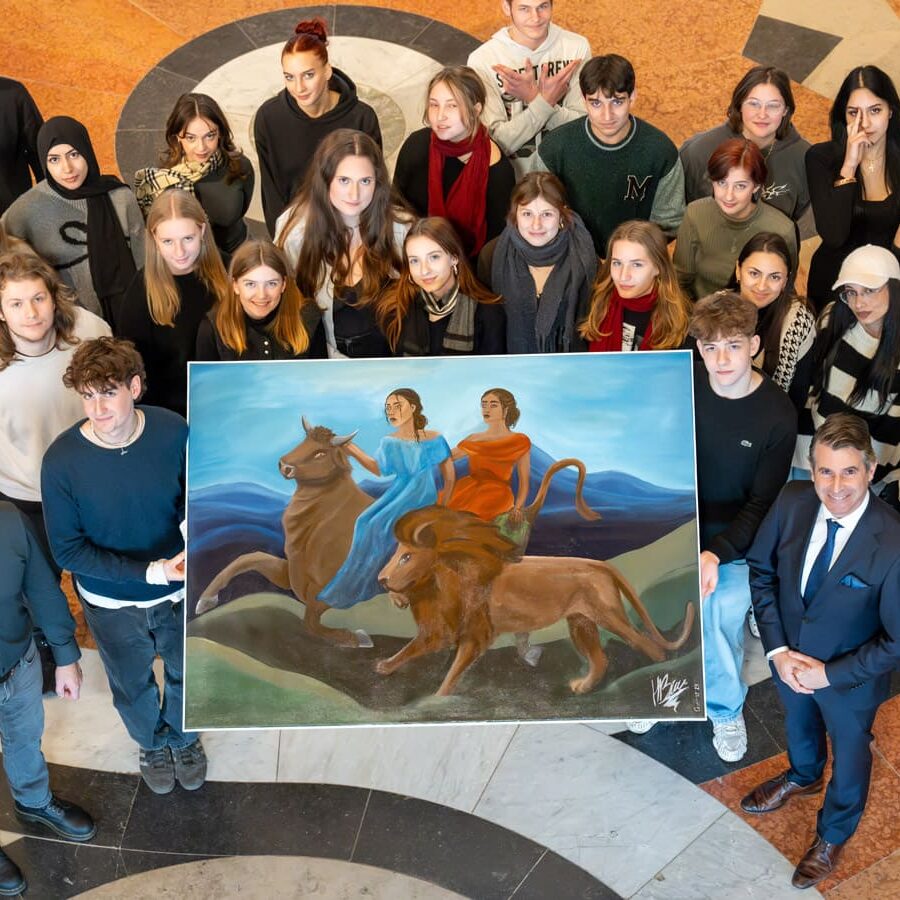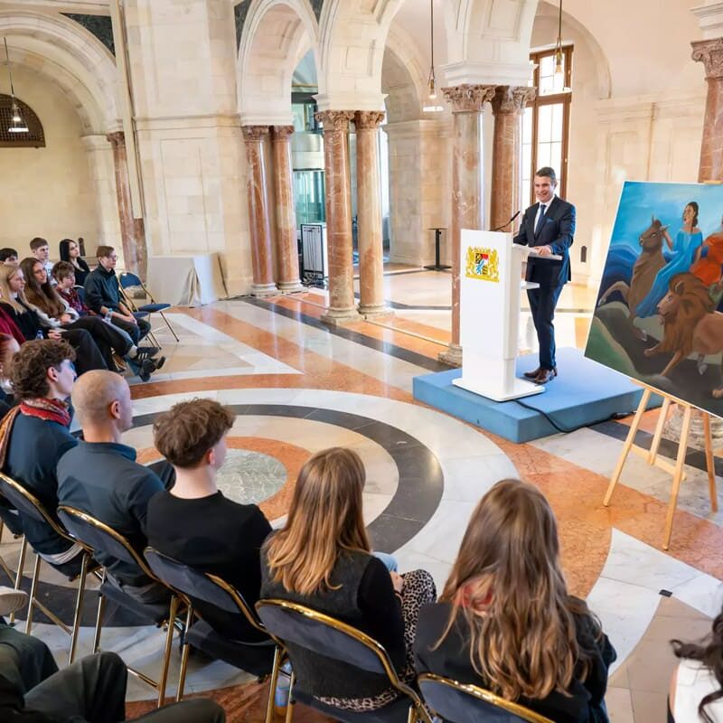 Dort durften wir uns nach der strengen Eingangskontrolle – ganz wie am Flughafen – bei Kaffee und Kuchen erfrischen. Dann wurde vom Staatsminister für Europaangelegenheiten und Internationales Herrn Eric Beißwenger das Bild von Hannes Blenk der G12b der FOSBOS Lindau enthüllt und ihm ein Preis überreicht. Er hatte den Wettbewerb zum Thema „Bayern und Europa“ mit dem Ziel der Anfertigung eines Kunstwerks für das Büro des Staatsministers mit seinem Konzept, das Bayerns Rolle in Europa visualisiert, gewonnen und fertigte deshalb über die letzten Wochen hinweg ein großformatiges Acrylbild dazu an. Jonas Rabauer wurde als Zweitplatzierter ebenfalls geehrt. Einen Augenblick später war eine offene Fragerunde eröffnet, bei der eben Bayerns zentrale Position in Europa und Europas Bedeutung für den Frieden von Herrn Beißwenger hervorgehoben wurde, aber auch zur Sprache kam, dass z. B. EU-Gelder nach Bayern fließen und dort helfen, „Brücken“ zwischen den Ländern zu bauen. So nahmen z. B. von der anwesenden Schülergruppe im vergangenen Schuljahr, fünf Schülerinnen und Schüler unserer ERASMUS+-Schule an einem Auslandsaufenthalt in Kilkenny und Dublin in Irland teil.
