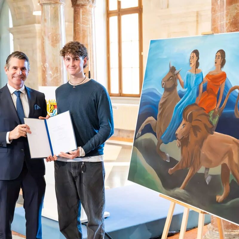 Staatsminister Eric Beißwenger übergibt Hannes Blenk, G12b der FOSBOS Lindau den ersten Preis für sein Bild