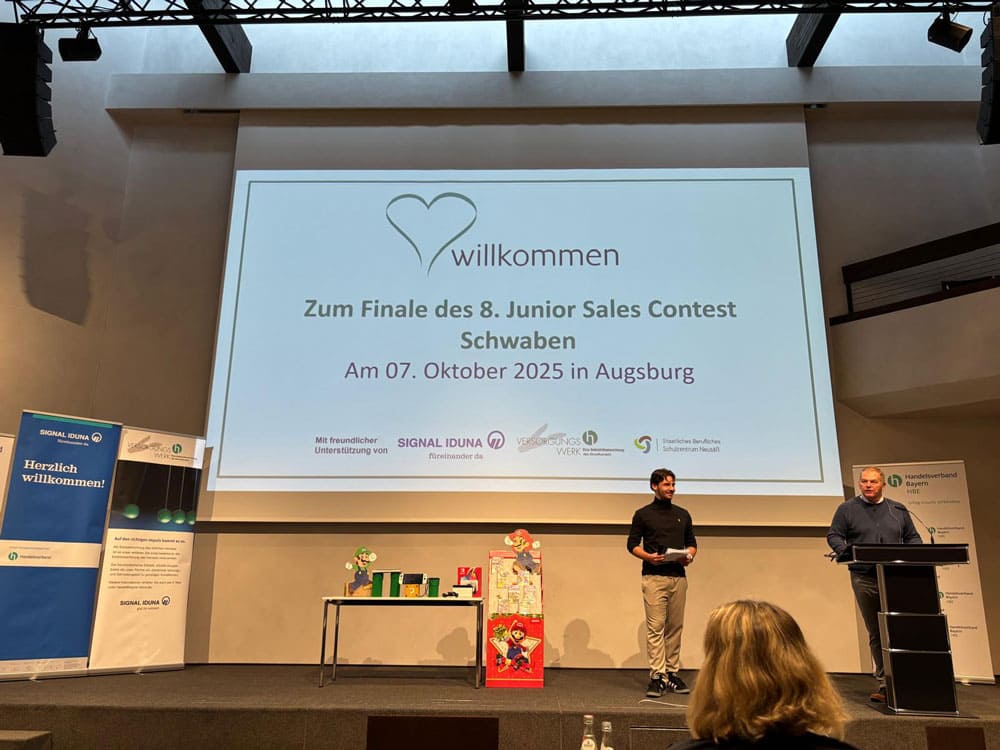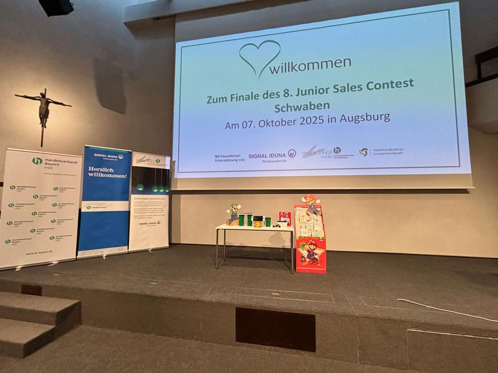 Am 07.10.25 war es in Augsburg soweit: Der Junior Sales Contest Schwaben, ein Verkaufswettbewerb für Auszubildende vom Handelsverband Bayern, fand zum bereits 8. Mal statt. Das BSZ Lindau, das zum 2. Mal an diesem Wettbewerb teilnahm, stellte hierfür eine Kandidatin aus der Einzelhandelsklasse 12. Die Teilnehmenden führen in diesem Wettbewerb ein 10-minütiges Verkaufsgespräch vor Publikum vor, das sie vorher gemeinsam im Unterricht geübt hatten. Auch ein englisch sprachiger Kunde muss bedient werden. Die besten Kandidaten bekommen Geld- und Sachpreise und der Gewinner / die Gewinnerin des Schwabenausscheids darf anschließend nach Salzburg fahren und sich dort mit Auszubildenden aus Österreich, der Schweiz und Südtirol messen. Auch gibt es einen Preis für die schönste Warenpräsentation zu gewinnen.