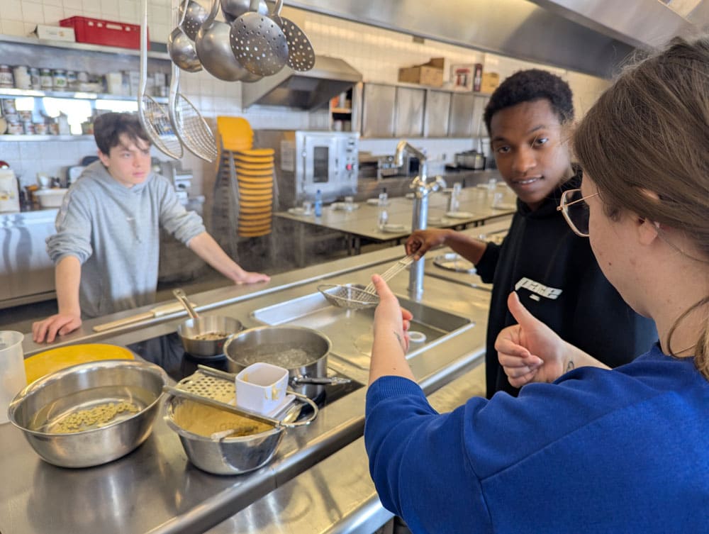 Besonders lebhaft wurde es in der Schulküche: Unter der Leitung von Sabrina Zigaus bereiteten die Schülerinnen und Schüler gemeinsam Bircher-Müsli, Granola und echte Allgäuer Käsespätzle zu – natürlich inklusive ausgiebiger Kostprobe. Auch ein typisch bayerisches Frühstück durfte in den darauffolgenden Tagen am BSZ natürlich nicht fehlen.