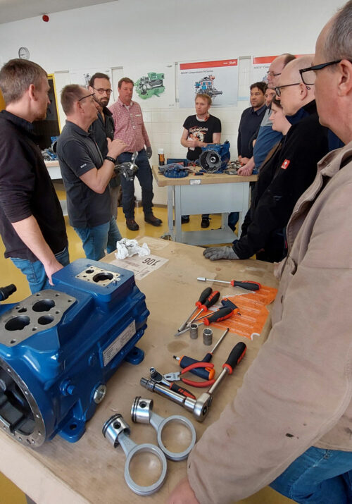 In den Faschingsferien trafen sich die engagierten Lehrkräfte, um unter Anleitung von Frank Alisch der Firma Danfoss-Bock selbst Hand anzulegen einen Hubkolbenverdichter in alle Einzelteile zu zerlegen und anschließend wieder funktionsfähig zusammenzubauen.
